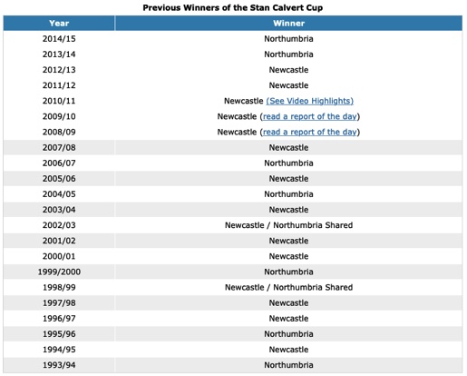 The Newcastle vs Northumbria rivalry first began in 1994 with the introduction of the Stan Calvert Memorial Cup. This cup was to commemorate the life of Stan Calvert, who dedicated time to his work in sports administration and was Chairman of the Northern Sports Council.