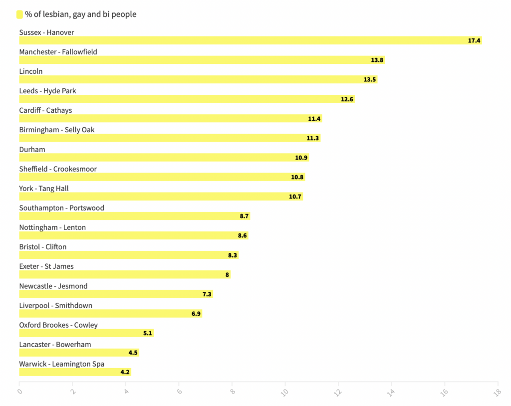In 2021, the ONS Census asked people about their sexuality and gender identity for the first time. Data regarding how many lesbian, gay and bi people live in main university student areas in the country revealed that 7.3% of Jesmond residents identify as queer.