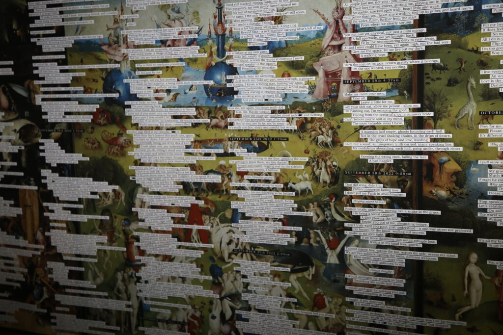 The art selection included a three thousand word poem overlaying Hieronymus Bosch’s ‘The Garden of Earthly Delights’ by student artist and Magsoc’s co-social secretary Chris. The piece was written during a dark time in the artist’s life, he used a heavy amount of religious imagery in the text and replaced real names in the poem with names of biblical figures.