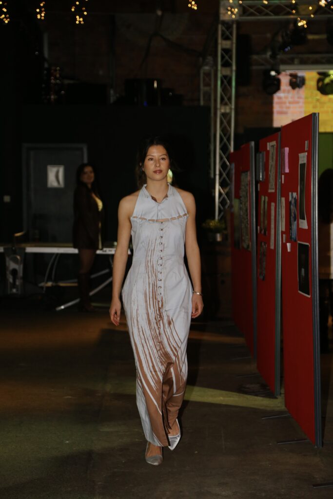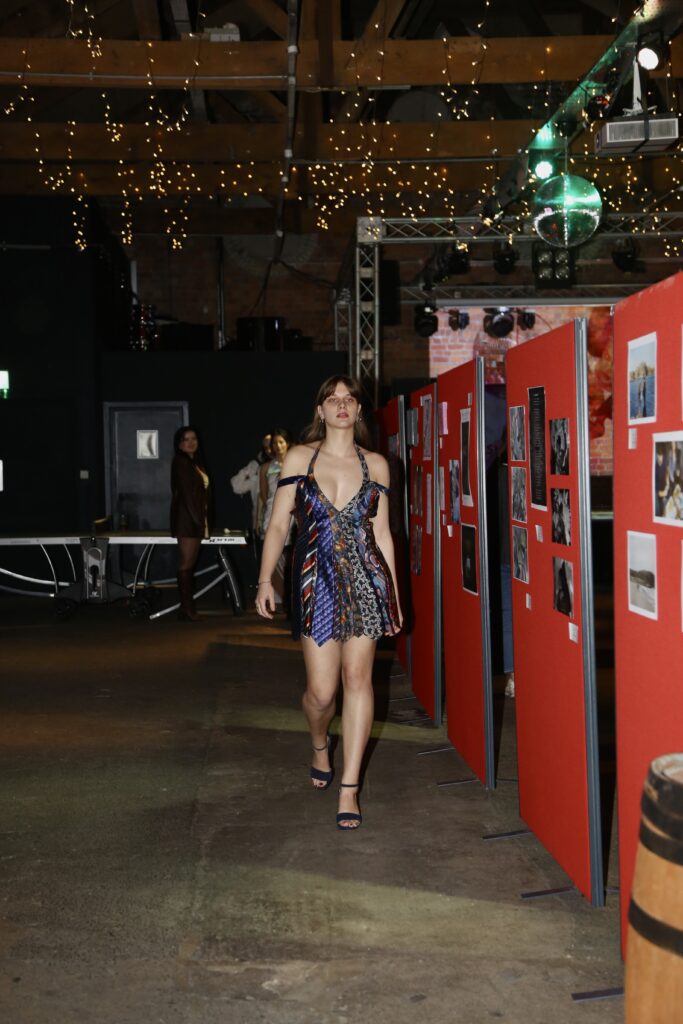 A personal highlight was the selection of pieces shown in the fashion show midway through the evening. Ranging from paired back denim skirts and tailored England shirts to a mini dress comprised of patterned silk ties. The show was an examination of the classic white shirt in all it’s forms, models used the art exhibition as a runway and brought together all art forms shown during the night.