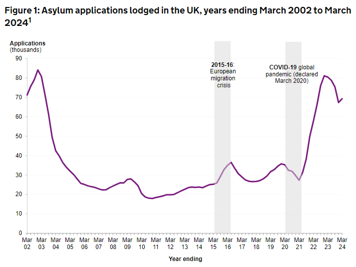 According to the UK government, in the year ending March 2024, the UK received 69,298 asylum applications involving 86,719 people. Of these, 86,460 cases are still awaiting preliminary decisions, involving 118,329 people. During the same period, 68,564 people were granted refugee status or other forms of protection through their asylum applications. The main countries of origin of asylum seekers include Syria, Iran, Iraq, Sudan and Eritrea.