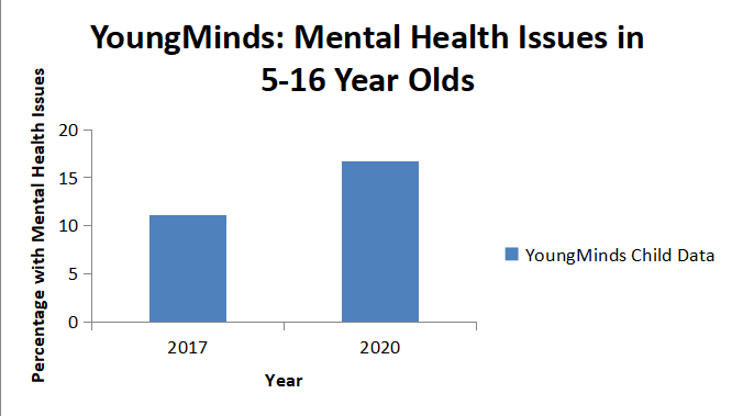 The YoungMinds report also states that between 2017 and 2020, the proportion of children aged 5 to 16 who have a mental health problem increases from 1 in 9 to 1 in 6 . This further suggests that mental health problems are not only prevalent amongst young people, but are also increasing amongst younger children.